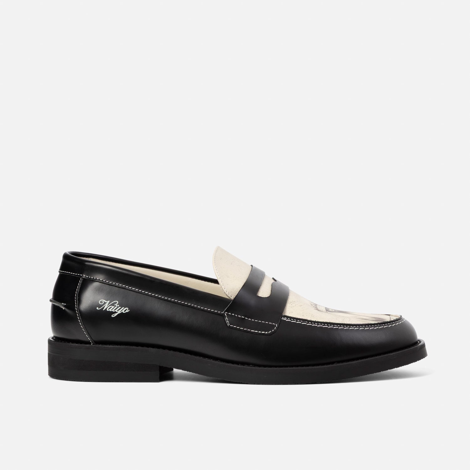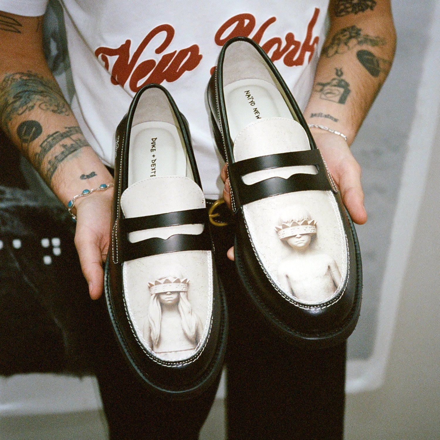 Part of our collaboration with DUKE + DEXTER, these NY Crown Penny Loafers are printed with Roy Nachum’s ‘The Stone that Makes a Mountain’ artwork at the vamps. They’re made from black and white leather and set on 25mm TPU soles that are custom-developed for comfort with every step. Details include co-branded, padded in-socks and a soft leather lining. Limited edition.