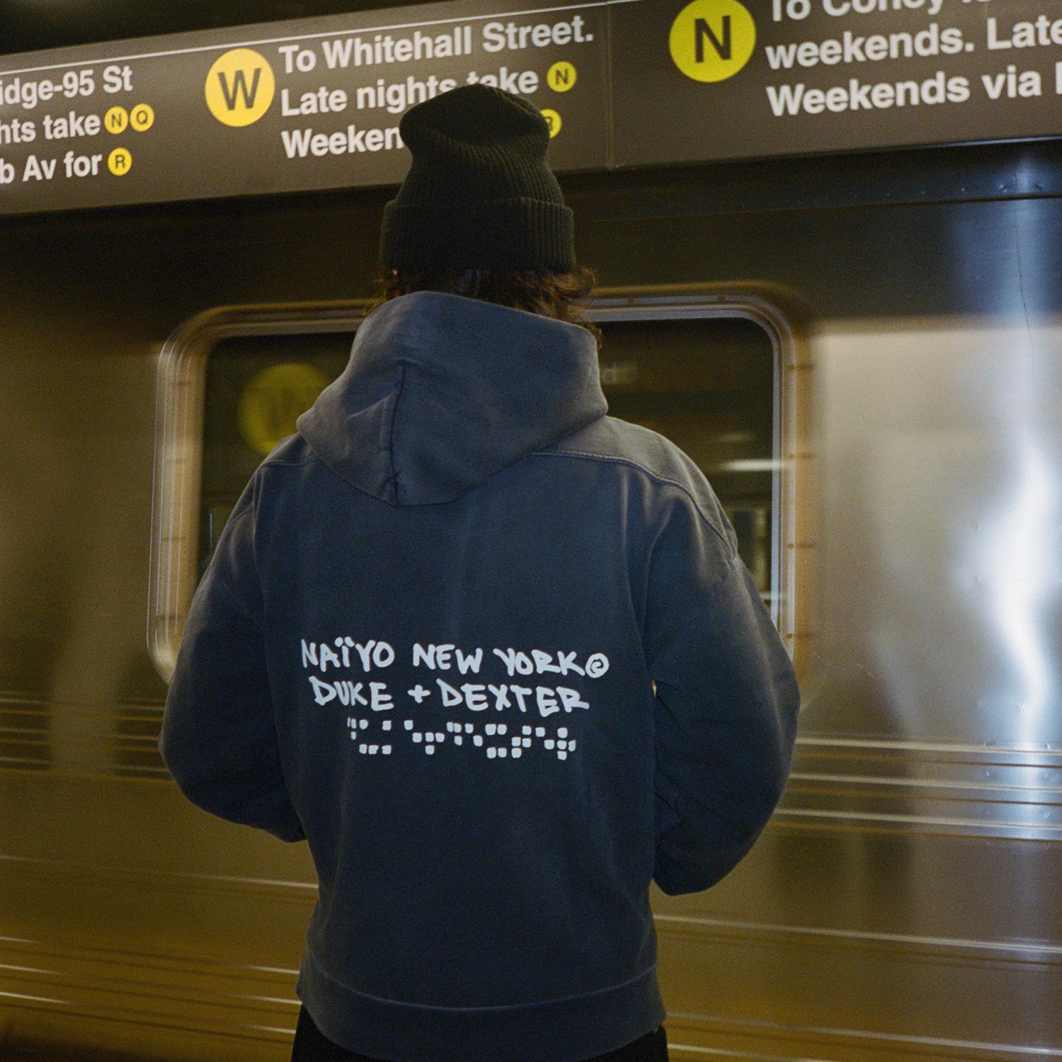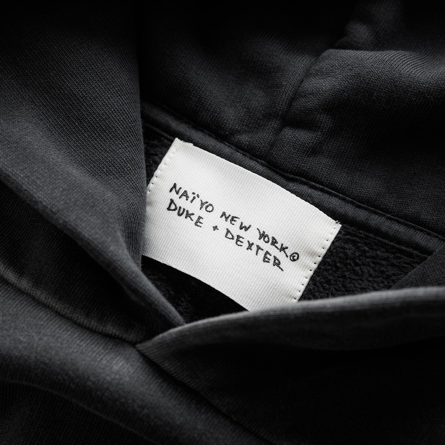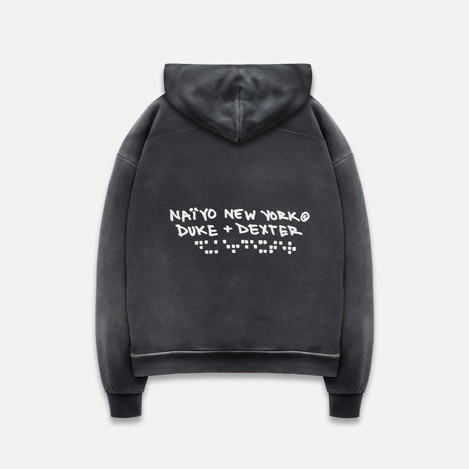 Designed in collaboration with DUKE+DEXTER, the NY Vintage Black Hoodie released alongside the ‘The Stone that Makes a Mountain’ exhibition at Mērcer Labs Museum. An ode to the Big Apple, it’s made from mid-weight cotton-jersey that’s washed and faded and detailed with puff-print artwork at the front and back, including a script ‘New York’ graphic and NAÏYO’s braille motif.