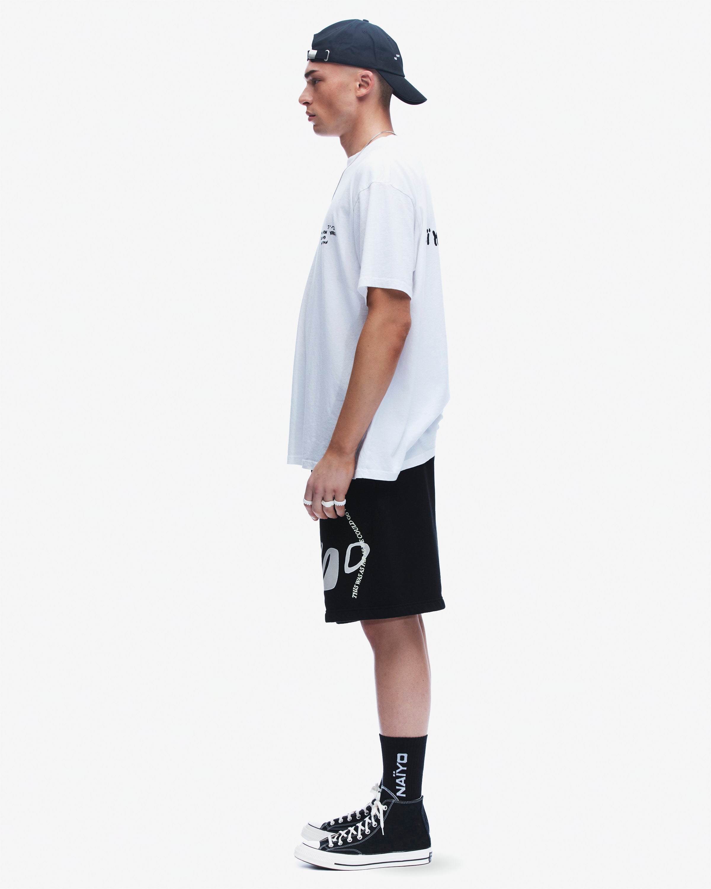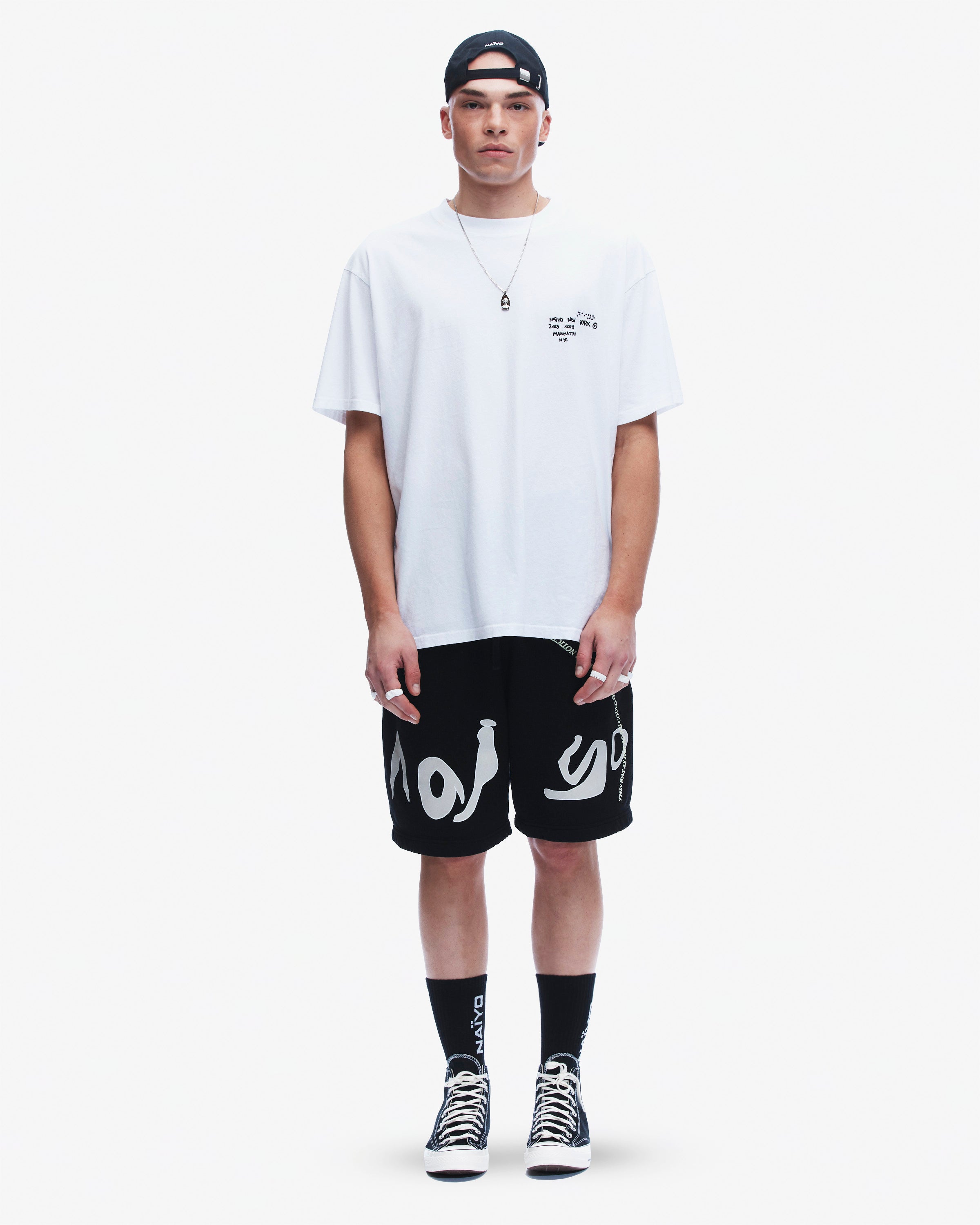 Screen print Naïyo logo artwork at back upper right leg